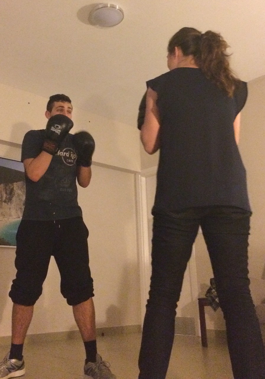 She led me to the student lounge downstairs where the couches had been pushed against the walls and two college students stood in the middle, putting boxing gloves on their hands. Seeing my wide eyes, one of them asked, “Have you ever boxed before?”