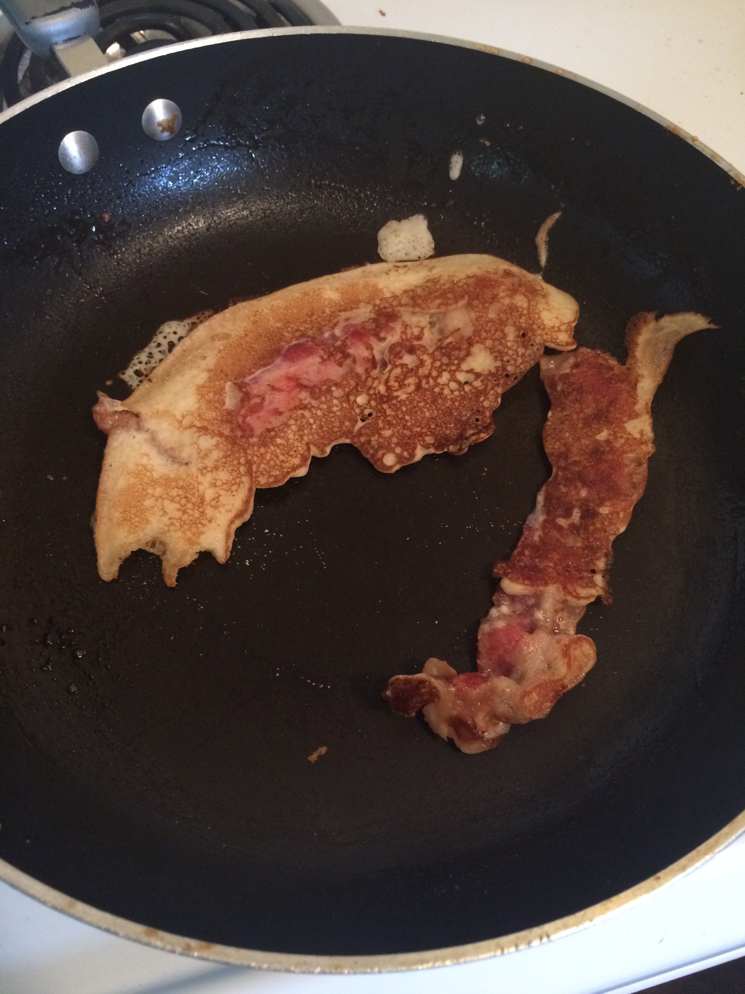 Emily had planned ahead and brought enough food for our lunches and dinners. On the first night, we divvied up food responsibilities, and everyone took part in cooking, serving, and cleaning up. James was the egg king, David served up some delicious bacon, and Joe ruled the grill. For my part, I made watery pancakes. Once everyone was fed, I fulfilled my recent obsession by teaming up with David to make pancacon. After two test runs (shown to the right), we finally discovered the glory of a pan-sized pancake with three slices of bacon embedded, slathered with syrup and rolled into a breakfast burrito.