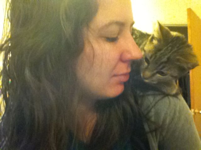 The Pouillys lived nearby on a farm. I used to babysit for their kids, and they always had a barn full of cats and kittens. On a whim, I stopped by in September of 2011. There were several cats, but only two three-month-old kittens. One was white and barely gave me the time of day. The other was a tabby cat with bright green eyes. When I picked up him, he snuggled into my arms. When I put him down, he wound around my legs. “Keep him safe!” I shouted. “I’ll be right back!”