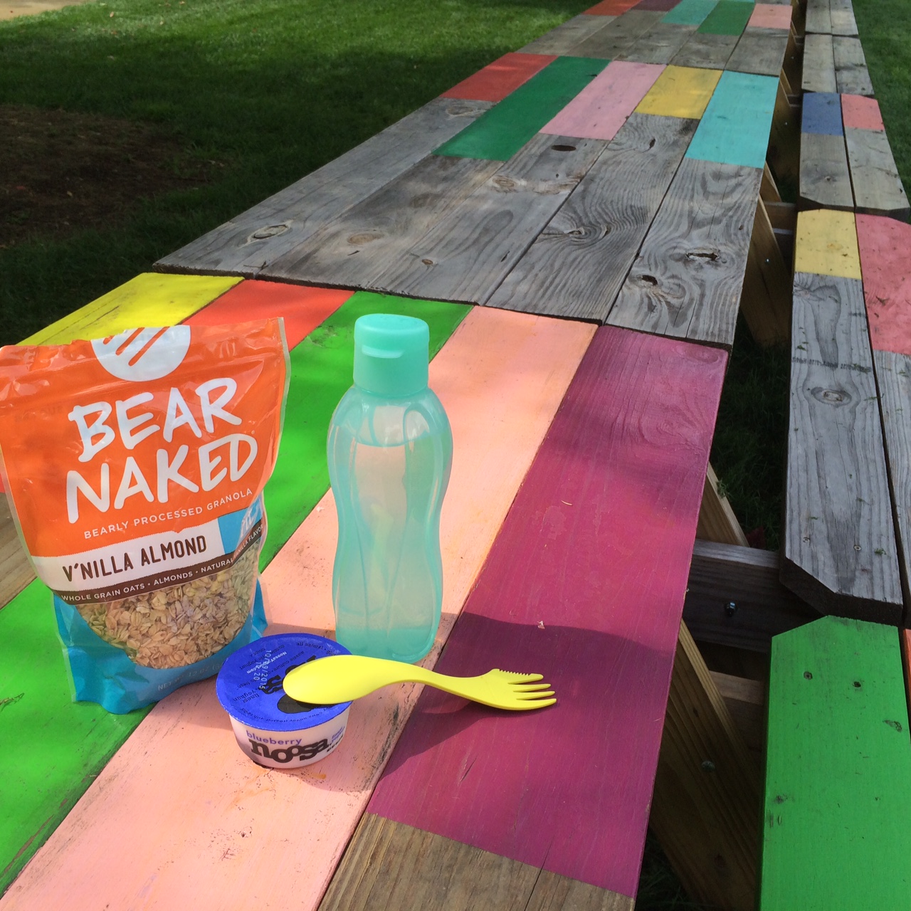 Well, kind of. I’d planned to stop in Indianapolis and picnic on the Funky Bones exhibit (as made popular by The Fault in Our Stars) at the Indianapolis Museum of Art. After four hours of driving, I discovered the museum is closed on Mondays!! Agh. Determined to fulfill my plan, at least partially, I picnicked on some colorful tables underneath weird sculptures, trying to ignore the yard workers passing by with weed-eaters and leaf-blowers.