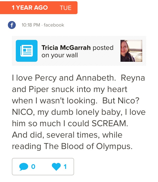 AND NICO! I love him. I love him so much, and I just want to wrap that self-hating and self-sacrificing idiot in the biggest hug imaginable. I was ecstatic to see him starting to make friends, trust people, and even falling in love with a guy from Apollo who is a healer. Could he have an any more perfect complement? I found an old Facebook status that I wrote while reading The Blood of Olympus the first time around, and it summarizes my feelings for Nico quite well.