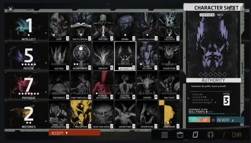 Disco Elysium is a point and click adventure of discovery: both of the identity of the murderer of a mysterious hanged man behind a hostel, and more importantly, of your own identity. The game begins with your Nameless Protagonist waking up from a massive hangover and implied suicide attempt. Throughout the game, you construct your personality with an ingenious character points tree that is more D&D than RPG. I of course leaned heavily on Empathy, which created a double edged sword: I was able to relate better to people around me, but I also felt the pain of my past more acutely without the ability to shove it down. I promise this is a game and not a therapy session.